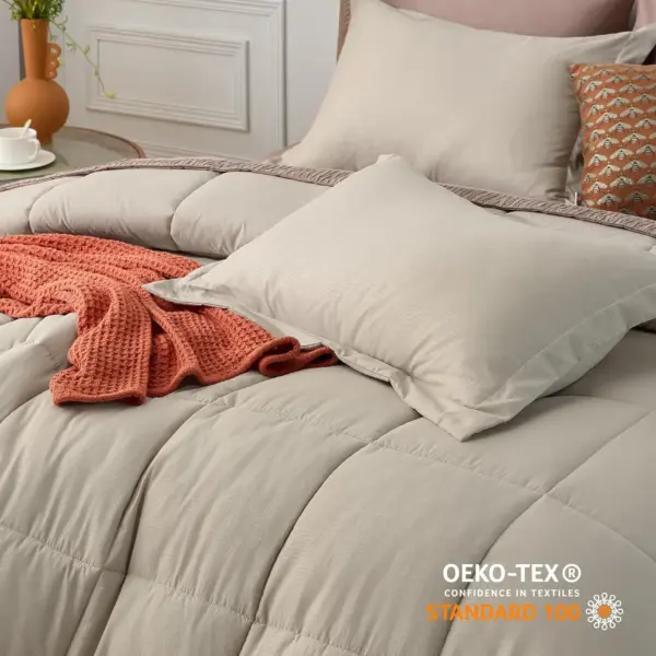 This Beige Basket Weave Pattern Down Alternative Comforter Set offers lightweight, all-season comfort. The set includes a comforter with box stitching, a fitted sheet, a flat sheet, and pillow cases. Made from 100% Microfiber with a double-sided grinding brush finish for a soft touch, this bedding set provides a modern style perfect for home use. The down alternative filling ensures cozy warmth suitable for any time of the year.
