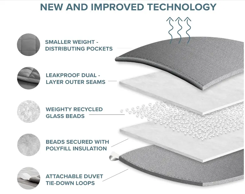 The box-quilted design ensures even weight distribution throughout the blanket, eliminating cold spots or bead migration. Corner loops allow easy attachment to a duvet cover for convenience and hygiene.